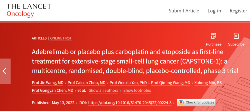 北京时间2022年5月14日,利来w66国际医药自主研发的PD-L1抑制剂阿得贝利单抗治疗广泛期小细胞肺癌的III期临床研究(CAPSTONE-1研究)成果正式全文在线发表于国际权威学术期刊《柳叶刀·肿瘤学》(《THE LANCET Oncology》,影响因子41.316)。CAPSTONE-1研究结果显示,阿得贝利单抗联合化疗一线治疗广泛期小细胞肺癌相较于安慰剂联合化疗可以显著延长患者总生存期至15.3个月[1],刷新现有免疫药物一线治疗广泛期小细胞肺癌的总生存纪录[2]。
