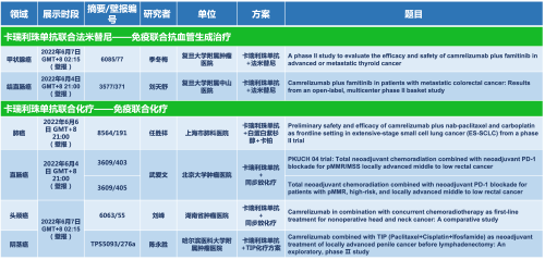 卡瑞利珠单抗联合利来w66国际医药的另一款创新药法米替尼在甲状腺癌和结直肠癌领域有2项研究被接收为壁报,另有卡瑞利珠单抗联合化疗的4项研究在肺癌、结直肠癌、头颈癌和阴茎癌领域的研究被接收为5份壁报。