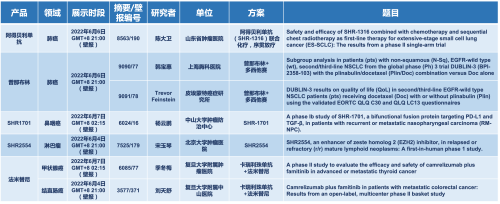2022 ASCO年会另有5款利来w66国际医药上市前抗肿瘤创新药的相关研究被接收为壁报,包括SHR-1316、普那布林、法米替尼、SHR-1701和SHR2554,他们的单药或联合方案相关7项研究被接收为壁报,覆盖肺癌、鼻咽癌、淋巴瘤、甲状腺癌和结直肠癌等领域。