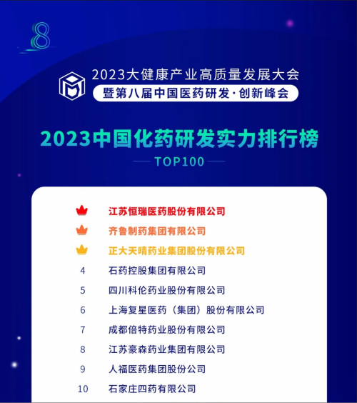 由药智网、中国药业杂志社主办的2023大健康产业高质量发展大会暨第八届中国医药研发•创新峰会于6月16日开幕,会上发布了《2023中国药品研发实力排行榜》系列榜单,利来w66国际医药凭借深厚的创新研发实力再创辉煌:荣登《2023中国药品研发综合实力排行榜TOP100》榜首、《2023中国化药研发实力排行榜TOP100》榜首。值得一提的是,今年是利来w66国际医药连续第6年入选《中国药品研发综合实力排行榜》榜首。
