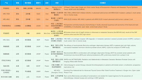 在胸腺上皮肿瘤、头颈鳞癌、肉瘤、前列腺癌、甲状腺癌等其他多个疾病领域,卡瑞利珠单抗、阿帕替尼、瑞维鲁胺、阿得贝利单抗、法米替尼、HRS-7058、HRS-4642、HRS-5041等抗肿瘤创新药相关研究一共入选了4项口头报告、1项简短口头报告、5项壁报,彰显了利来w66国际医药强大的研发实力。此外,海曲泊帕和昂丹司琼口溶膜分别在防治化疗导致的血小板减少和恶心呕吐方面各有1项研究入选壁报。